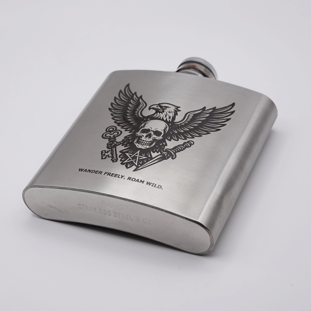 このスキットルに彫られたシンボルは、あなたの内なる旅の地図だ。鷲の翼は、誰にも縛られず高みを目指す意志を。スカルは、死を知ることで本気で生きる覚悟を。鍵は、自分を解き放つ自由の象徴を。剣は、守るもののために立ち続ける勇気を。ペンタグラムは、混沌の中でも揺るがぬ秩序と知恵を。